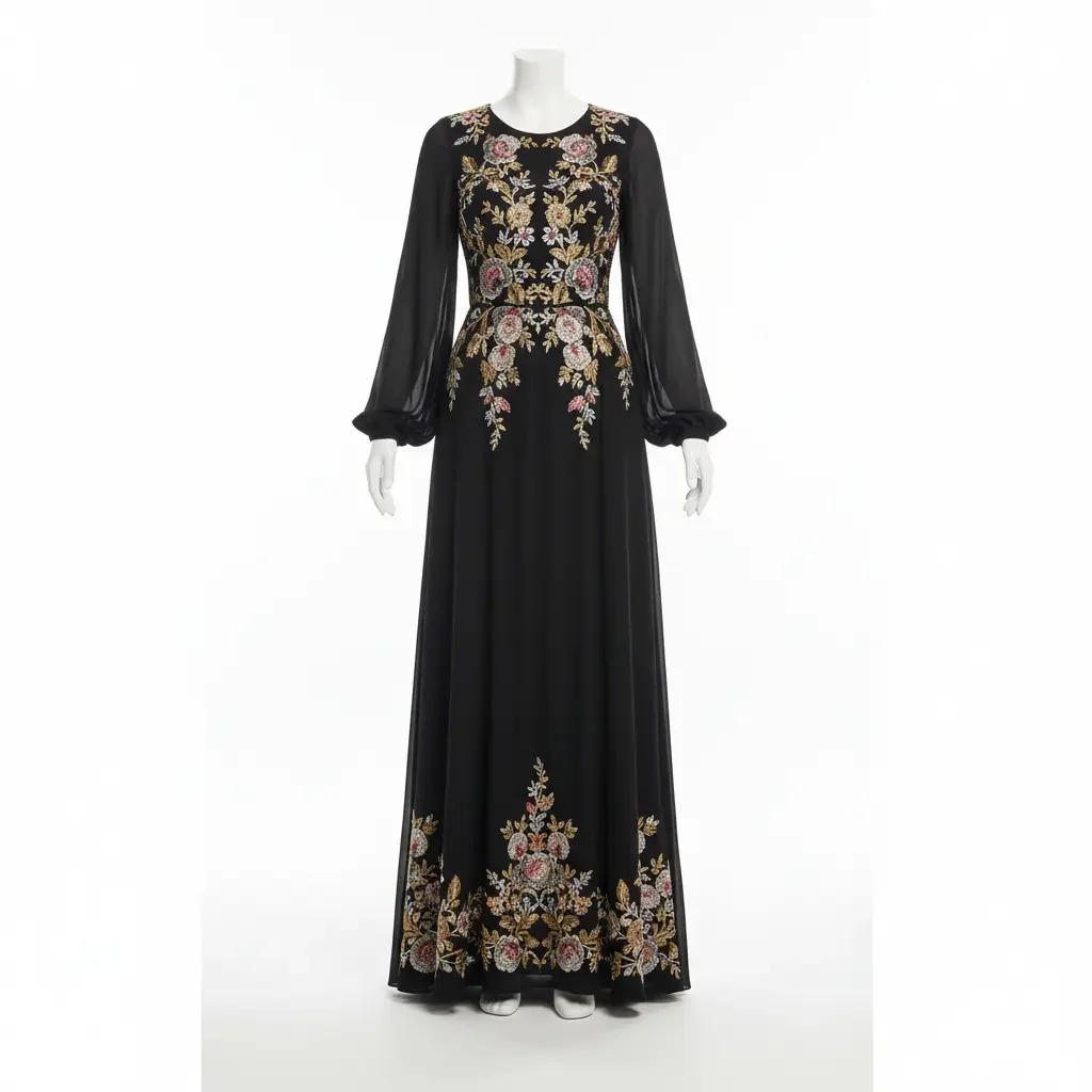 Flowing maxi dress adorned with intricate hand-embroidered floral motifs. Crafted from lightweight cotton voile with a full lining.